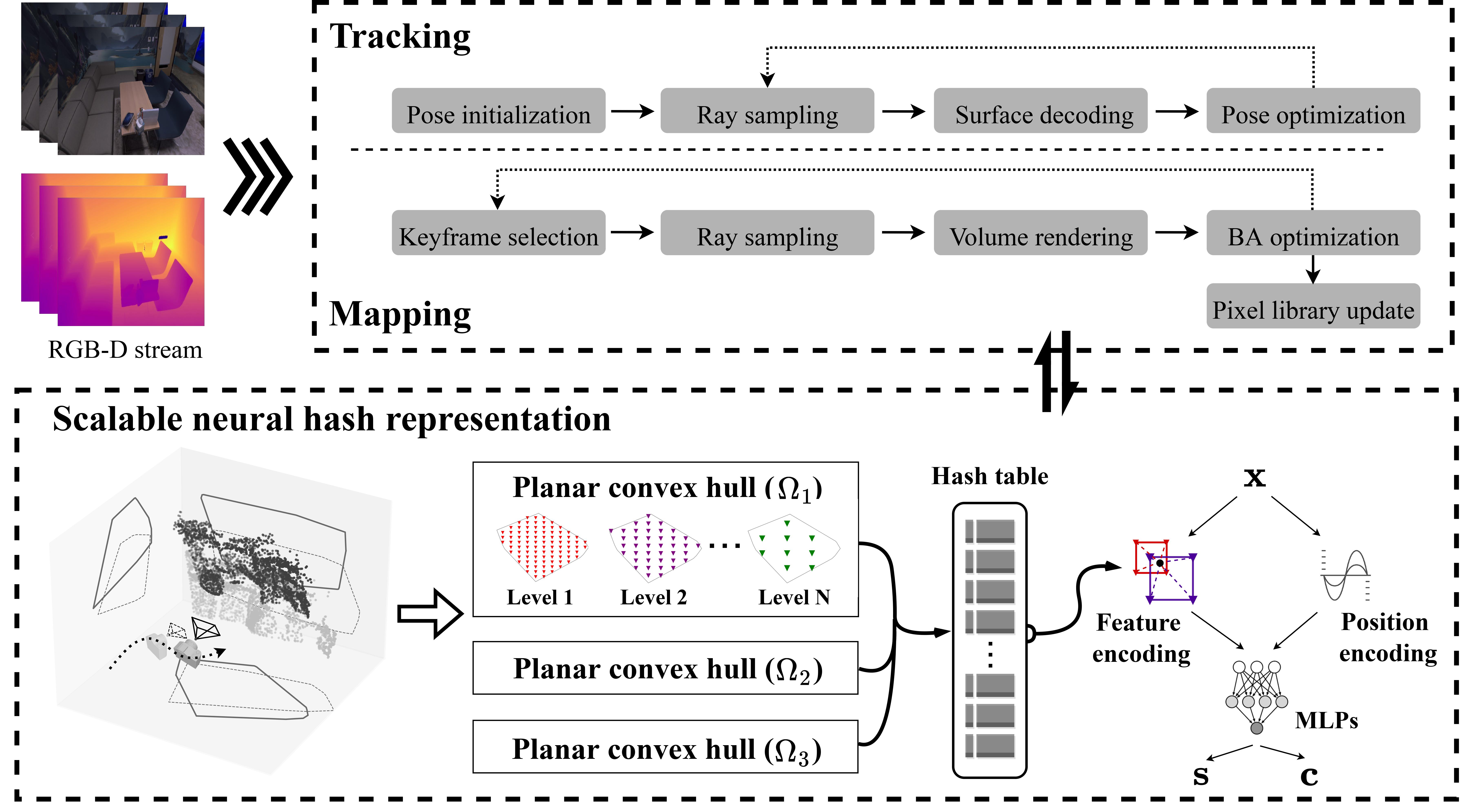 System Overview. 1) Scalable neural hash representation : for each mapping frame, the multi-scale grid features are partitioned based on perceptual convex hulls and inserted into a hash table. While decoding the RGB and TSDF values for a given spatial coordinate using MLPs, the input feature vector is obtained by joint feature coding and position coding. 2) Tacking : keep the map fixed and sample rays only on the current frame to optimize the camera pose. 3) Mapping : Sample rays from selected global keyframes and jointly optimize the scene representation along with the poses of these frames through bundle adjustment.
